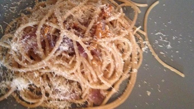 Mettere a lessare gli spaghetti in abbondante acqua salata, per circa 5 minuti. Nel frattempo, stufare la cipolla tagliata a julienne con un filo di olio, a fuoco basso, per circa 3-4 minuti. Scolare la pasta e saltarla nella padella con la cipolla, aggiungendo un po’ della loro acqua di cottura, con lo speck croccante e le noci sminuzzate ed una spolverata di parmigiano .