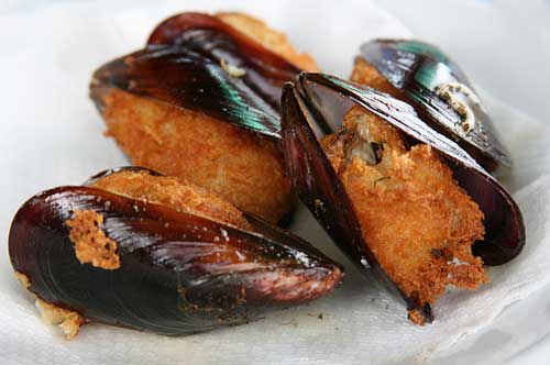 Far aprire le cozze a fuoco vivo in un tegame coperto, far raffreddare per staccare i molluschi .