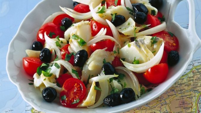400 gr pomodori ciliegina1 foglia alloro1 kg baccalà ammollato1 carota4 cucchiai olio evo1 ciuffo di prezzemolosale q.b.pepe q.b.5 bicchieri vino bianco2 cipolle bianche1 cucchiaio aceto bianco1 gambo di sedano200 gr olive nere snocciolatePreparazione :In abbondante acqua lessare il baccalà . Lasciare a bagno il baccalà già ammollato per 1/2 giornata in acqua fredda, cambiando l’acqua 3-4 volte: risulterà meno sapido.In una pentola, versare abbondante acqua e aggiungere la costola di sedano, la carota, la cipolla, l’alloro, il vino bianco e sale. Far bollire per 30 minuti e poi, nel brodo ottenuto, immergere il baccalà per circa 20 minuti. Scolarlo, pulirlo , eliminando la pelle con un coltello ben affilato e togliere le eventuali spine residue con la pinzetta; poi tagliarlo a tocchettiLavare e tagliare a metà i pomodorini ciliegini; spellare la cipolla e ridurla a spicchi; lava e trita il prezzemolo. Preparare un vinaigrette emulsionando in una ciotola un pizzico di sale e pepe con l’aceto e unire poi l’olio a filo mescolare con una piccola frusta.Tritare il prezzemolo. Distribuire il baccalà nei piatti, unire i pomodori, la cipolla e le olive, spolverizzare l’insalata con il trito di prezzemolo, condirla con la vinaigrette preparata e servire