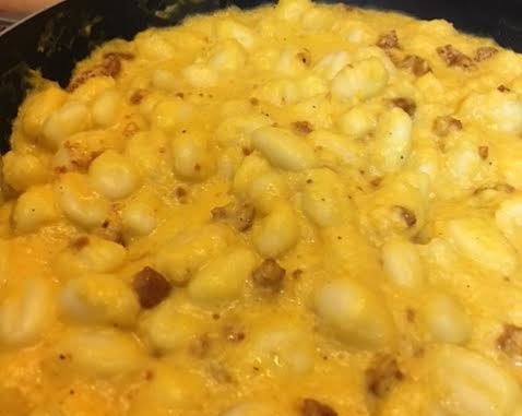Far cuocere gli gnocchi , appena salgono a galla scolarli e versarli nella crema di zucca , aggiustare di sale e pepe , aggiungere la pancetta e mescolare .