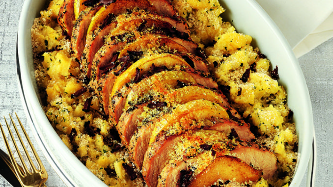 Lavare, detorsolare, affettare le mele con la buccia e rosolarle in padella con una noce di burro, sale e pepe. Disporre le patate lungo i bordi di una capiente pirofila che possa passare dal forno alla tavola, poi sistematevi al centro le fette di arrosto alternate con quelle di mela.