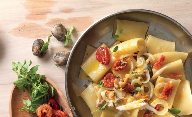 Tagliare le seppie a striscioline e condirle con 4 cucchiai di olio, sale e origano. Scaldare in un’ampia padella le vongole e il loro sugo.