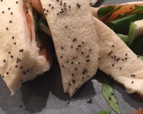 Con l’aiuto di un pennello distribuire il burro sulle fette di pane , distribuire il salmone ed il songino .Arrotolarle e chiuderle a caramella . Lasciare in frigo almeno 3 h .