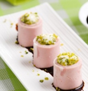 Prender le fette di mortadella e ritagliare dalla parte centrale di ciascuna 3 strisce larghe circa 3 cm. Versare su un tagliere tre quarti di pistacchi già tritati, stendere sopra la crescenza e rotolala formando un cilindro di circa 2 cm di diametro con i pistacchi che aderiscono alla crescenza dandole consistenza.