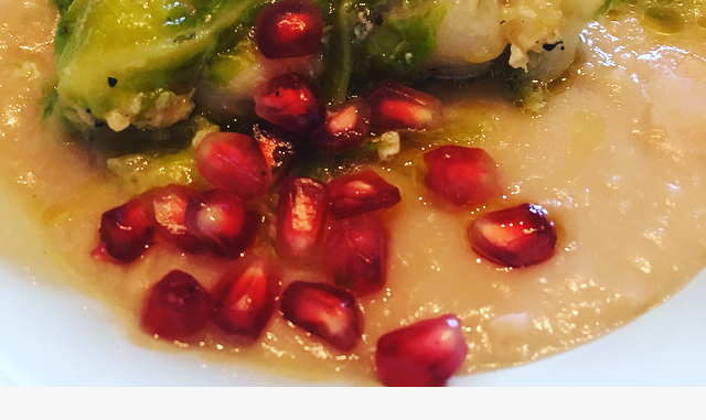 Servire i bocconcini di pesce sulla crema di cannellini , guarnendo con la melagrana