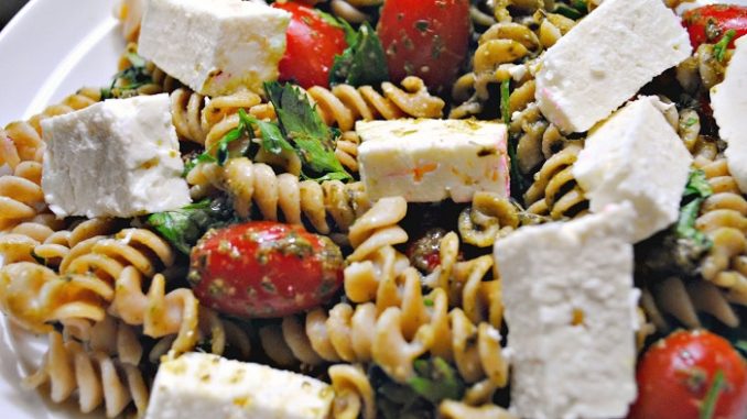 Mettere in una terrina i fusilli e condirli con un filo d’olio; unire i pomodorini, la rucola lavata, asciugata e spezzettata, le olive, il sedano tritato grossolanamente e la feta sbriciolata. Mescolare e condire ancora con un filo d’olio, se necessario. Lasciare insaporire al fresco per circa 15 minuti e servire.