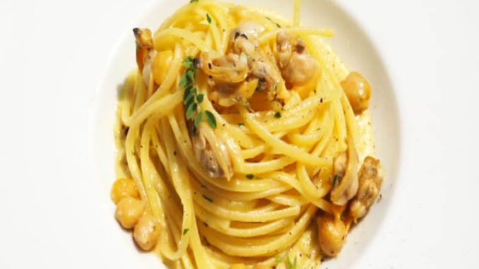 Lessare la pasta e scolarla al dente , versandola nella padella dove si sono fatte cuocere le vongole , unire sia la crema di ceci che quelli interi e un po’ di rosmarino e le vongole