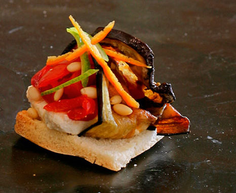 Mettere le melanzane arrotolate sul pane tostato e cospargere di pinoli