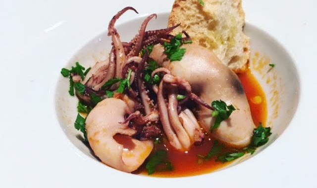 Impiattare mettendo il guazzetto sul fondo , poggiare i totani e i crostini , spolverizzare un po di prezzemolo tritato .