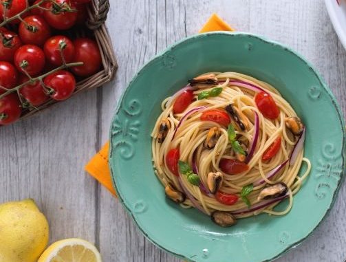 Versate il restante liquido di cottura delle cozze in un tegame capiente assieme all’ acqua fredda , portate a bollore e cuocere gli spaghetti (devono risottare), lasciare asciugare completamente l’acqua di cottura, mescolando gli spaghetti di tanto in tanto affinché non si attacchino .Quando mancheranno 3 min. al termine della cottura, aggiungere i pomodorini, la cipolla scolata e le cozze ed infine l’emulsione a base di limone , mescolare gli ingredienti affinché si amalgamino in maniera uniforme , finendo la cottura .