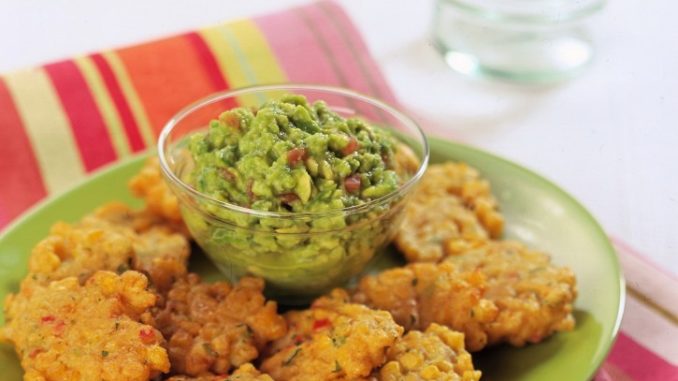 Scaldare abbondante olio in una larga padella antiaderente, tuffare poco per volta il composto di mais a cucchiaiate e friggere le frittelle 2 min ogni lato . Sgocciolare su carta da cucina, metterle sul piatto da portata, salare leggermente e servirle ben calde, accompagnate con la salsa guacamole.