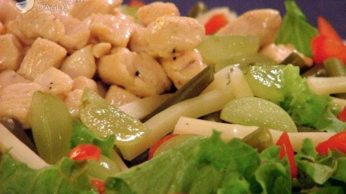 Pulire i fagiolini spuntando le estremità e togliendo i filamenti, lavarli e lessarli per 15 min. in acqua salata. Pulire l’insalata , lavarla ed asciugarla .Lavare l’uva e tagliare gli acini a spicchi. Ridurre il formaggio a cubetti ,lavare i pomodorini e tagliarli a spicchi.Mettere nella ciotola del pollo tutti gli ingredienti tranne l’insalata e l’uva e mescolare bene. Regolare di sale se necessario.Disporre in un piatto l’insalata, l’uva e i restanti ingredienti.