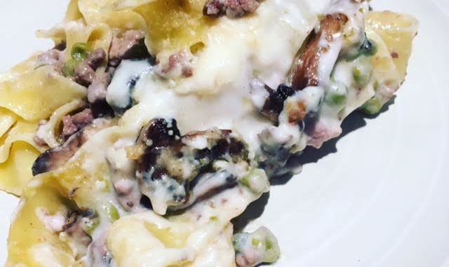 In una pirofila versare sul fondo della besciamella , aggiungere un parte della pasta , i piselli , i funghi e la salsiccia , ed altra besciamella , fare un secondo strato ed ultimare con besciamella e parmigiano