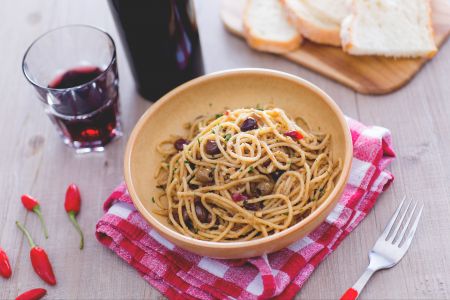 Cuocere gli spaghetti in una pentola con abbondante acqua salata, . Tritare finemente la cipolla rossa e lo spicchio d’aglio, metterli in padella con olio evo e far soffriggere per qualche minuto, mescolando di tanto in tanto perché il soffritto non si attacchi al fondo della padella . Sciacquare bene i capperi sotto acqua corrente per liberarli del sale in eccesso e tritate grossolanamente,quindi aggiungerli al soffritto , mescolare e unire anche le acciughe ed il peperoncino.Lasciare cuocere a fuoco dolce mescolando spesso, fino a quando le acciughe non si saranno sciolte, se necessario allungare con un mestolo di acqua di cottura della pasta.aggiungere le olive ed il prezzemolo tritato , mescolare bene ,; scolare la pasta e versare i padella , mescolare e far saltare gli spaghetti , Tostare il pangrattato in una padella con un filo d’olio, togliere dal fuoco ed unire alla pasta aggiungendo un mestolo di acqua di cottura,mescolando bene ed impiattare .