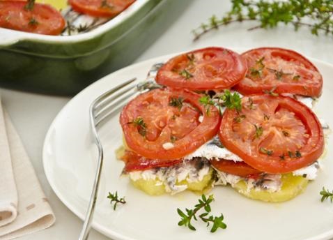 Pulire le alici eliminando la testa, la lisca e le viscere. Lavarle sotto l’acqua corrente e tamponatele con carta da cucina. Ungere il fondo di una teglia rettangolare , formare un primo strato con le fette di patate , proseguire con le alici (con il dorso rivolto verso l’alto) e con le fette di pomodoro. Condire con un pizzico di sale e un filo d’olio. Continuare fino a esaurimento degli ingredienti, quindi condire ancora con l’olio, il sale e timo. Infornare a 180 °per circa 40 min.