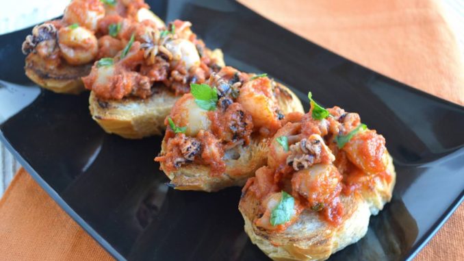 Tostare il pane sulla piastra di ghisa. Condire il pane con le seppioline ed il loro sughetto .