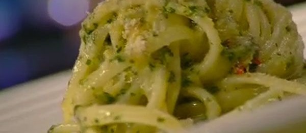 Cuocere gli spaghetti alcuni minuti e poi versarli in padella per completare la cottura aggiungendo un paio di mestoli di acqua di cottura . Aggiungere il prezzemolo tritato e mescolare , aggiustando di sale (la pasta deve risultare molto fluida, aiutandosi con l’acqua di cottura ).