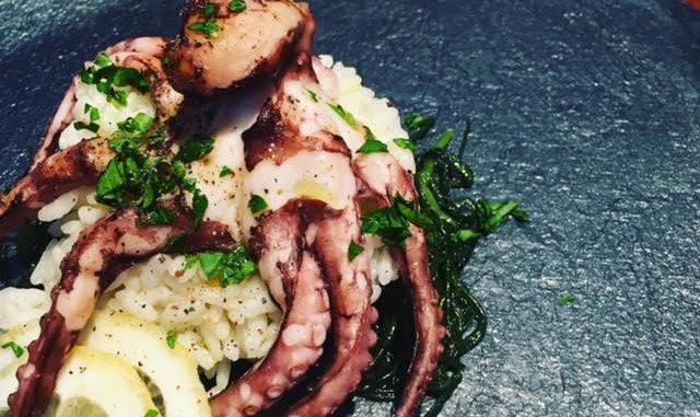 Impiattare sistemando sul fondo del piatto gli agretti , poi il riso , ed infine il polpo guarnito con prezzemolo tritato .