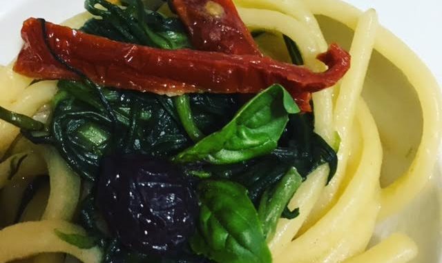 In una padella scaldare l’olio con l’aglio , unire gli agretti ed il peperoncino , salare e proseguire la cottura per 3-4 min. Unire i pomodori secchi tagliati a filetti e le olive tagliate a metà , mescolare e far saltare alcuni minuti .