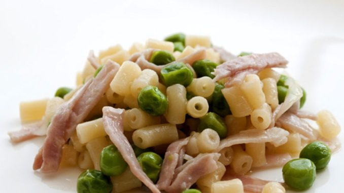 In una pentola con olio far rosolare la cipolla e la pancetta (o il prosciutto crudo), aggiungere i piselli , allungare con 2 bicchieri d acqua calda e lasciar cuocere ,aggiustando di sale , (se necessario aggiungere acqua calda )e portare ad ebollizione per cuocere la pasta , durante la cottura aggiungete acqua se necessario, pepare ed impiattare .