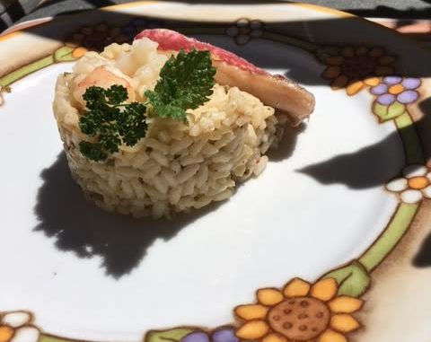 In un wok soffrigere il composto con olio per qualche minuto , far tostare il riso . Aggiungere , pian piano il fumetto di pesce filtrato e portare a cottura il riso , spegnere ed aggiungere la tartare di gamberi (con il calore della pentola si scotteranno)