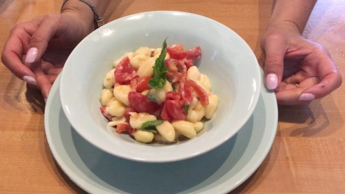 Cuocere gli gnocchi (pochi minuti )appena salgono a galla scolare e passare sotto l’acqua corrente per far raffreddare .Versare nel recipiente e cominciare ad amalgamare il tutto , aggiungere la stracciatella e mescolare , aggiustare di pepe ed un po di olio .