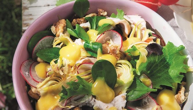 Pulire i carciofi e affettarli sottilmente, condirli con limone e sale e lasciateli riposare per 15 min, infine strizzarli. Completare l’insalata mescolando la fesa di tacchino, tagliata a fettine sottili, con la misticanza, i carciofi, i ravanelli a fettine sottili e i gherigli di noce. Condirla con l’emulsione.