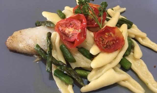 Impiattare sistemando sul fondo del piatto il filetto di scorfano , a pasta ed infine i pomodori confit , guarnire con del prezzemolo.