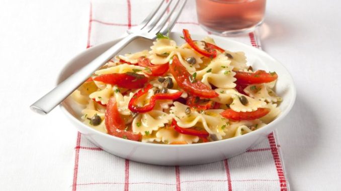 Tagliare i pomodori rossi , metterli in una ciotola , unire il peperone tagliato a listarelle , i capperi , l’aglio sbucciato , il prezzemolo , il sale e l’olio , mescolare e lasciar marinare per 1 h , eliminare l’aglio.