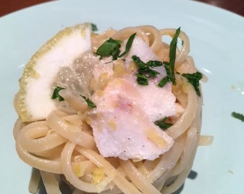 Lessare la pasta , scolarla 4 minuti prima della fine della cottura , versarla nella padella e aggiungere un po’ per volta il fumetto fatto con le interiora dello scorfano , cominciare a girare , aggiungere le zeste di limone grattugiate e il succo dei limoni , aggiustare di sale e pepe .