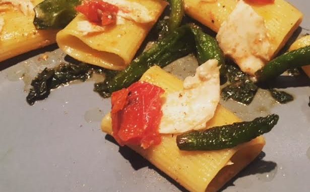 Impiattare mettendo sul fondo la crema di basilico , i rigatoni , un po di pesce , qualche pomodoro ed i peperoncini .
