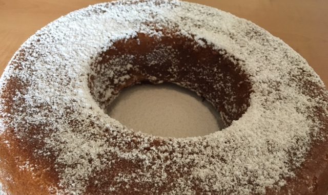 Aggiungere le nocciole .Versare il composto in uno stampo imburrato ed infarinato .Cuocere a 170° per 30 min . Decorare con lo zucchero a velo .