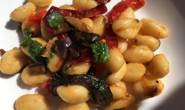 Cuocere gli gnocchi , e versarli nella padella ,facendoli saltare , aggiungere la rucola tagliata a pezzi ed il basilico .