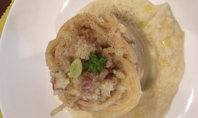 Impattare , mettendo sulla base del piatto un po di crema di cavolo, aggiungere del pepe bianco