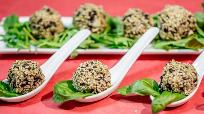 Unire al riso i gamberi, l’avocado ed il trito di fiocchi di mais , aggiustare di sale e mescolare . Formare delle polpettine, passarle nel sesamo .