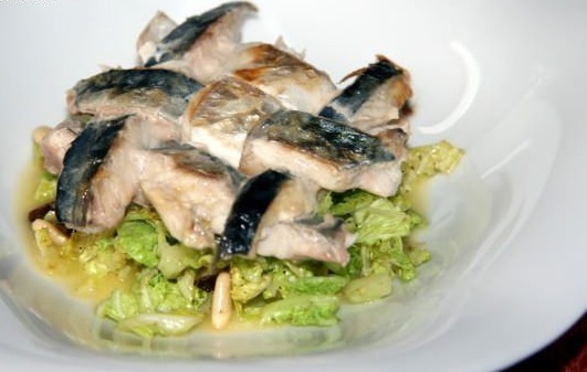 Prendere ora un piatto fondo e allargare un paio di cucchiai di salsa, adagiare la verza con i pinole e l’uvetta e le alici .