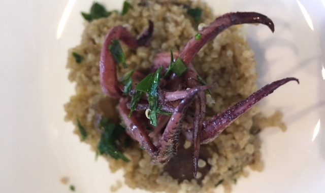 In un altra padella soffriggere uno spicchio di aglio con olio , versare i calamari puliti aggiustare di sale e pepe e portarli a cottura .Ed ora impiattare .