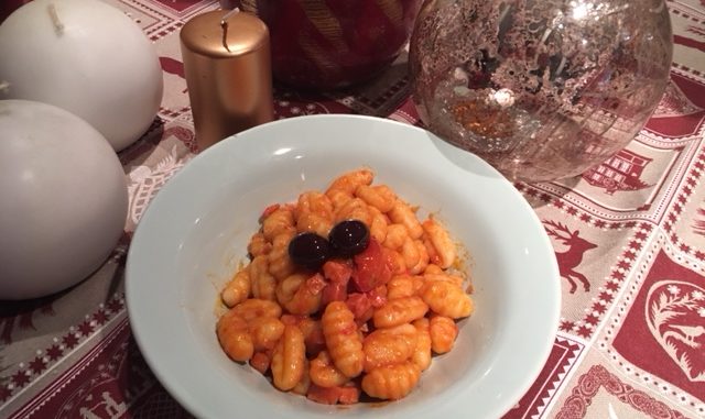 In una padella soffriggere l’aglio con olio , aggiungere il guanciale e far rosolare , unire i pomodori e aggiustare di sale . Far cuocere per 7/8 minuti , aggiungere le olive e spegnere .