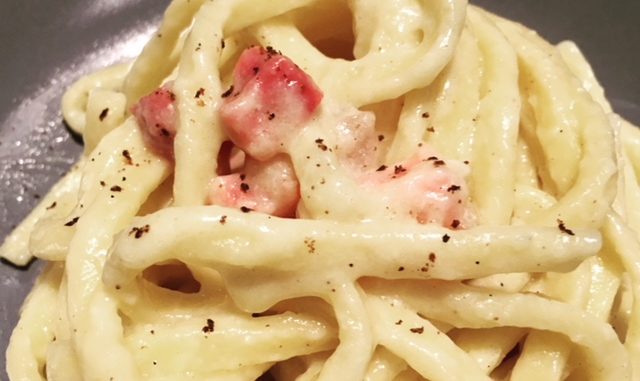 Tagliare il guanciale a cubetti , versarlo in una padella e rosolare con un po’ di olio, attenzione a non bruciarlo media altrimenti rilascerà un aroma troppo forte. Lessare la pasta .In una ciotola lavorare i tuorli con il pecorino ed il parmigiano , insaporire con il pepe, amalgamare tutto con una frusta a mano. Scolare la pasta al dente nella padella del guanciale, mescolare per insaporirla . Togliere la padella dal fuoco, versare il composto delle uovo con i formaggi , aggiungere un po’ di acqua di cottura e mescolare .