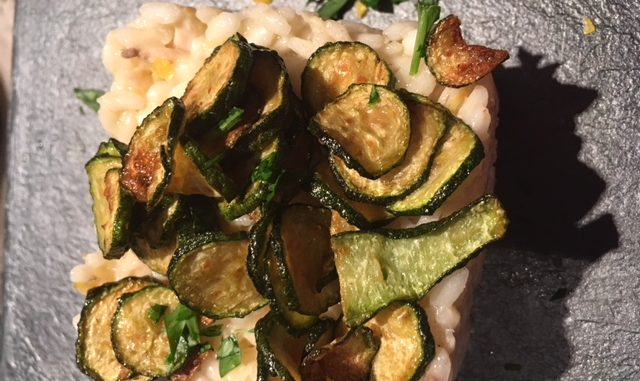 Impattare sistemando il riso in un coppapasta , adagiare sopra le zucchine e guarnire con prezzemolo e zeste di limone .