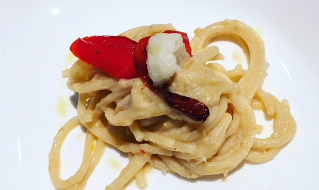 Nella padella dove si sino fritti i peperoni , versare la crema di cavolo , aggiustare di sale .Cuocere la pasta e versarla al dente nella crema di cavolo, aggiungere la polpa di riccio un po di pepe e amalgamare il tutto . Unire i peperoni .