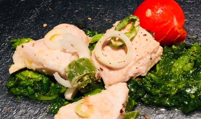 Impiattare sistemando sul fondo i friarielli, il maiale il peperoncino e la cipolla