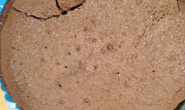 Imburrare e spolverizzare con cacao uno stampo a cerniera, versare l’impasto, cuocere a 180° C per 40 min , finché si formeranno crepe sulla superficie della torta
