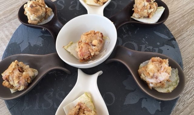 Con l’aiuto delle mani preparare dei tartufini di gorgonzola e pancetta , passarli nei taralli sbriciolati ed adagiarli su una fetta sottile di sedano rapa .