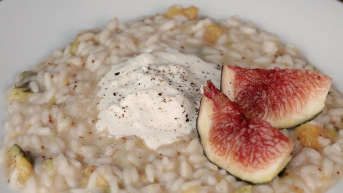 Quando il riso sarà pronto, aggiungere l’erba cipollina, il passato i fichi e i fichi a pezzi. Aggiustare di sale e pepe e continuare a mescolare perché il risotto non si attacchi.