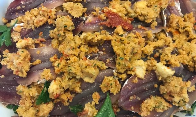 In una pirofila stendere un primo strato di panatura , sistemare le alici , continuare a strati fino a finire gli ingredienti .