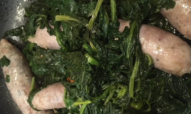 In una padella far soffriggere l’aglio in camicia con il peperoncino , aggiungere i friarielli con un po della loro acqua e dopo alcuni minuti le salsicce , coprire con un coperchio e portare a cottura rigirando ogni tanto .