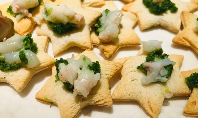 Sistemare su ogni stella un po di pesto ed un pezzetto di scampo