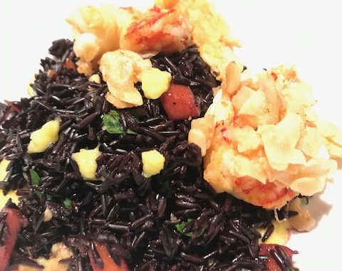 Passare i gamberi nell’uovo sbattuto sbattuto e nelle mandorle a lamelle, più volte, e friggere in olio di arachidi caldo.