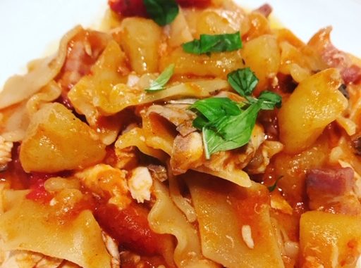 Aggiungere dell’acqua alle patate e lessare la pasta . Scolarla e versarla nella padella del coccio , mescolare il tutto .